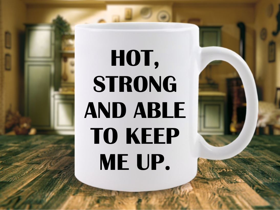 Detalii: Cana este imprimata cu “My man is just like my coffee.” pe o parte si cu “Hot, strong and amble to keep me up.” pe cealalta parte.