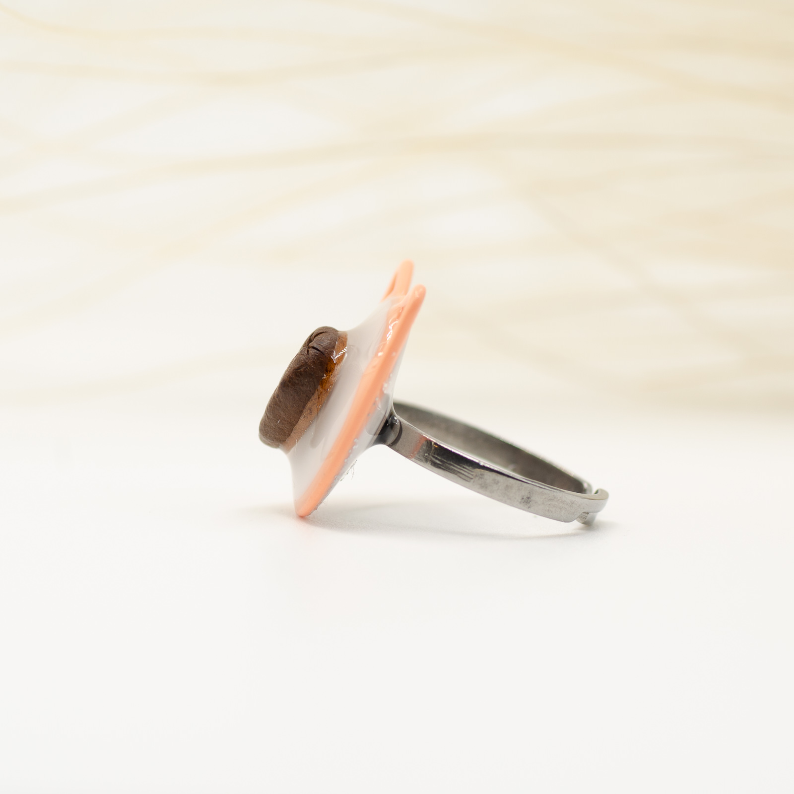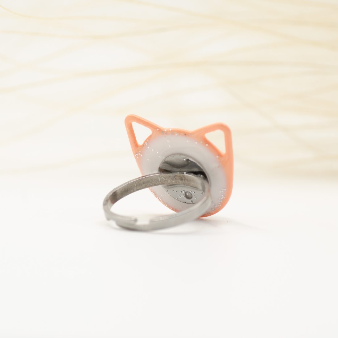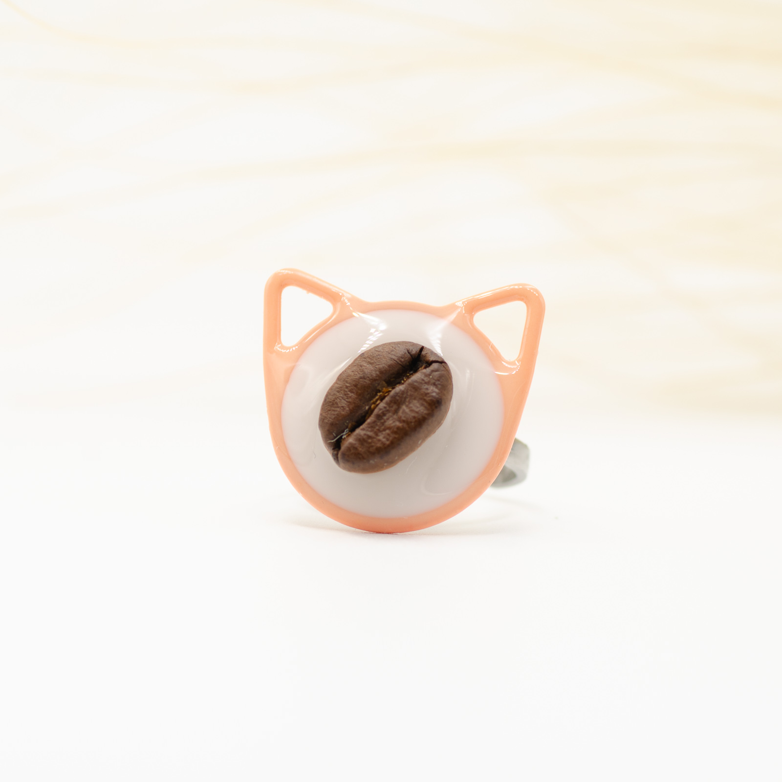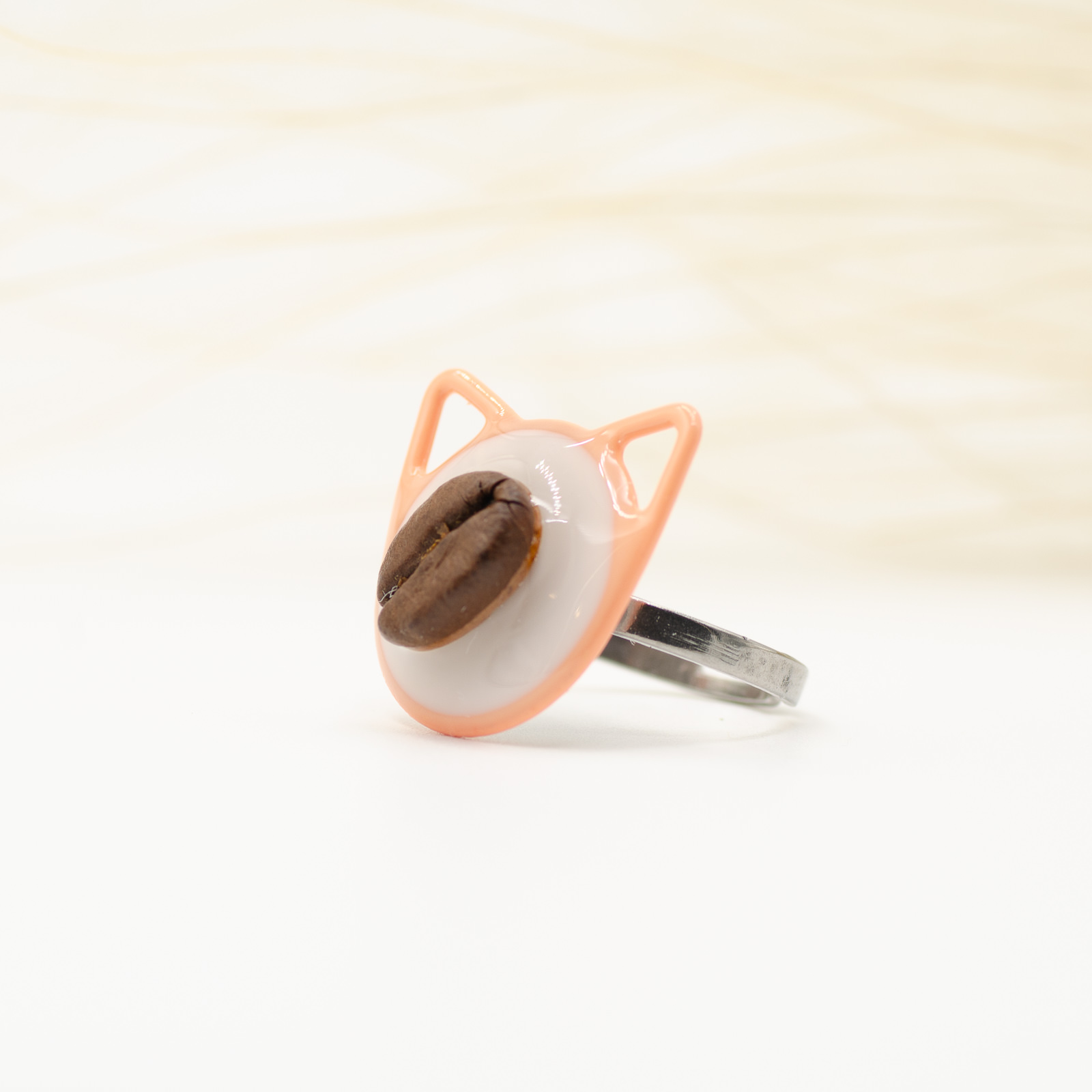 Un inel jucăuș, în formă de cap de pisică, cu o boabă de cafea naturală în centru. Conturul metalic vopsit în nuanță portocalie evidențiază suprafața din rășină albă, pentru un look modern și plin de personalitate.