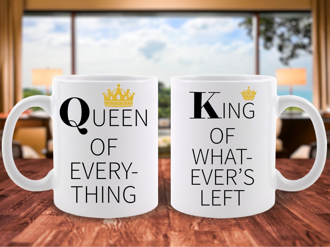 Detalii: Setul este compus din 2 cani; o cana “Queen of everything” pentru ea si o cana “King of whatever’s left” pentru el. Fiecare cana este imprimata cu aceeasi imagine pe ambele fete.